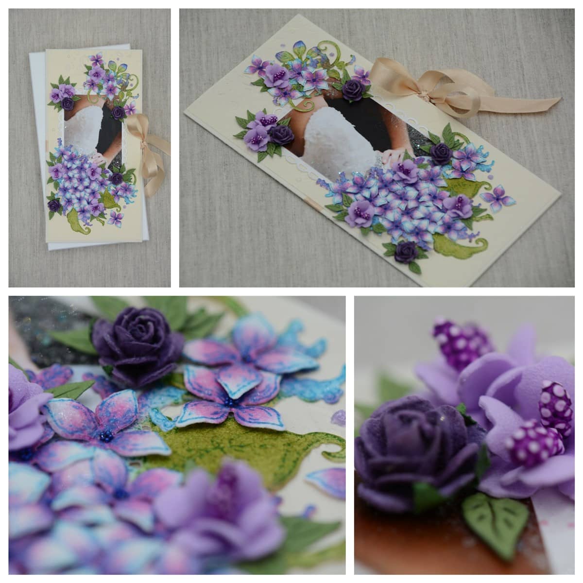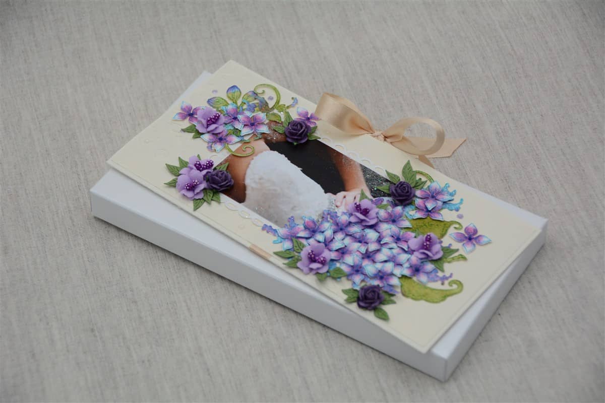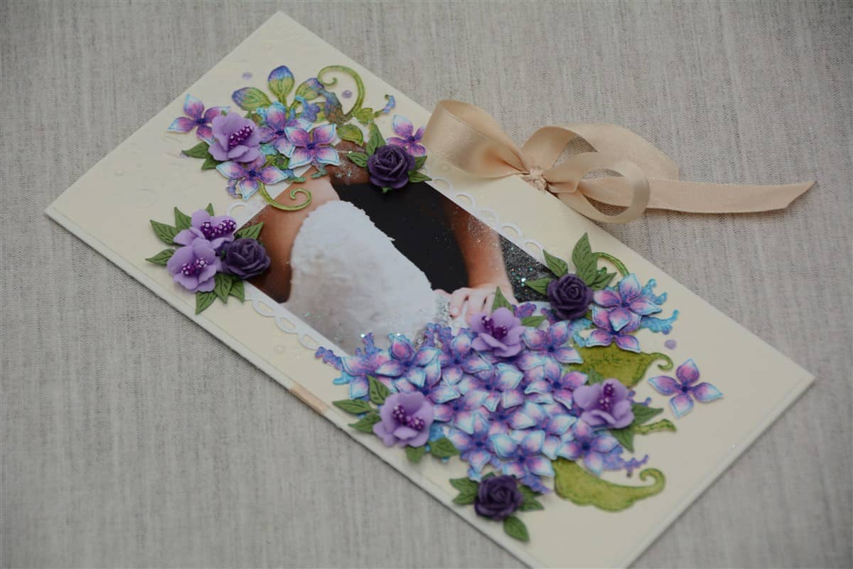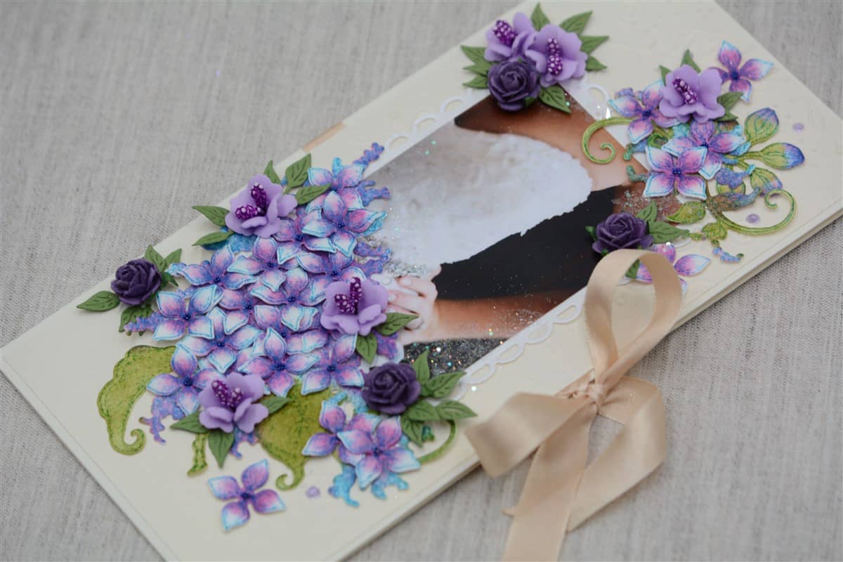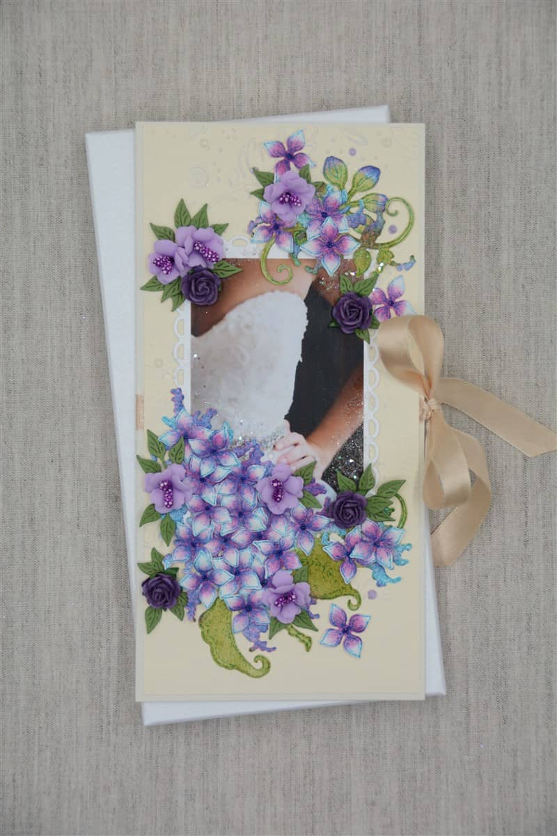 Kreemikat tooni kartongist käsitöökaart, mida kaunistavad käsitööpaberist ja foamiraanist käsitööna valmistatud lilled ning pulmateemalised elemendid. Kaardi sees on rahatasku. Käsitöökaart on paelaga kokku sõlmitav.