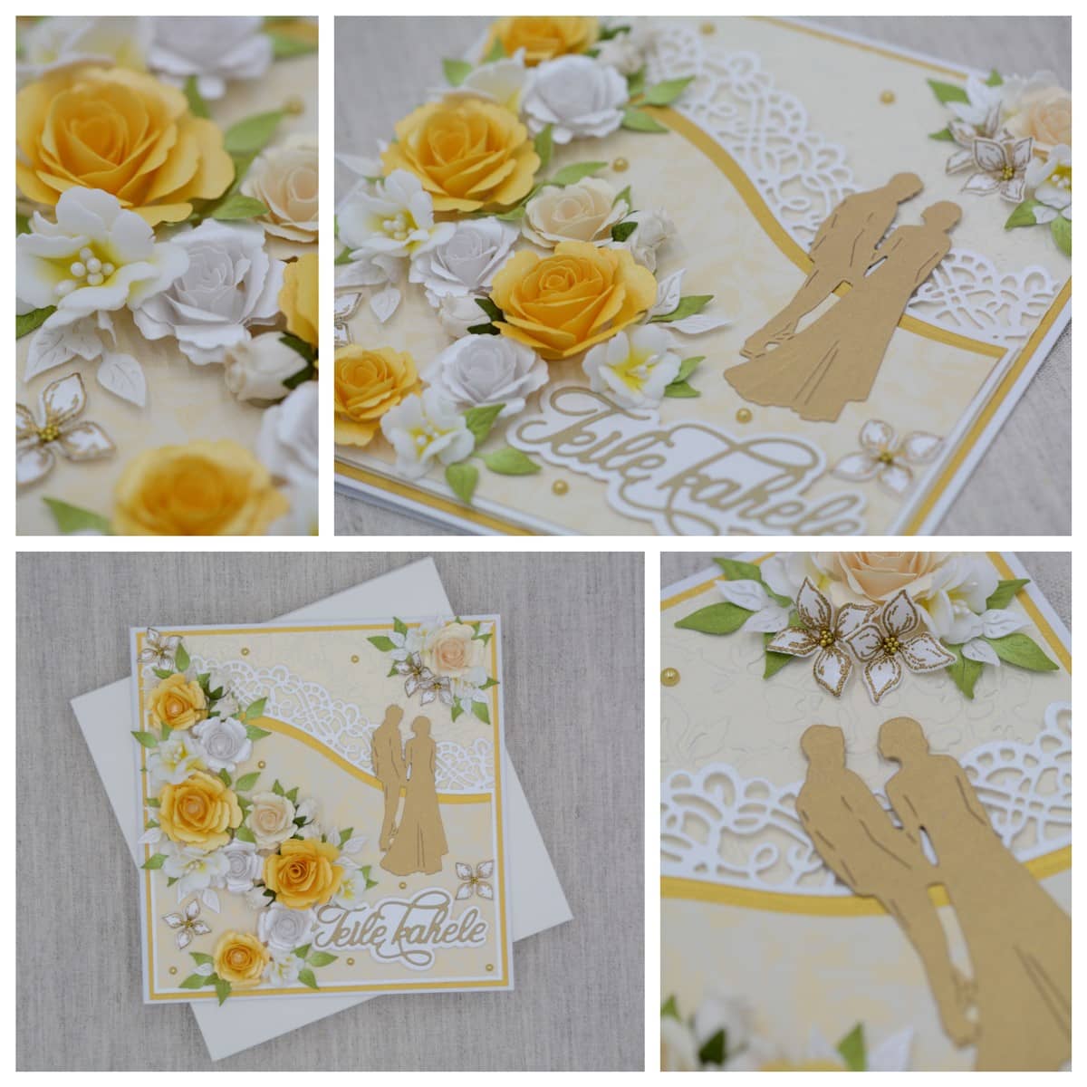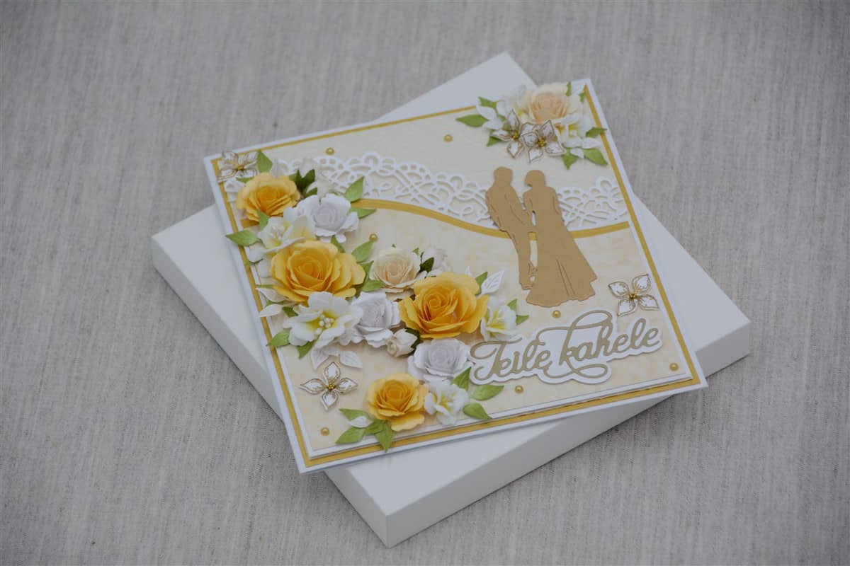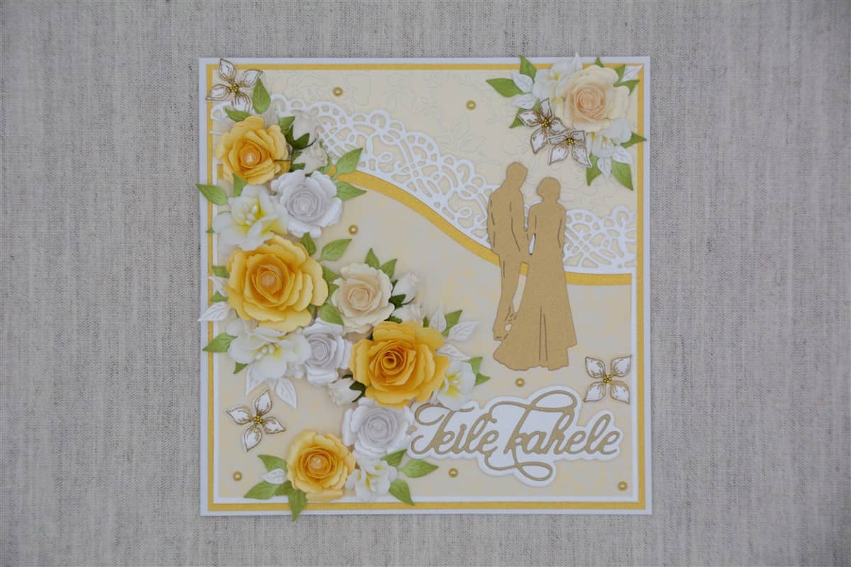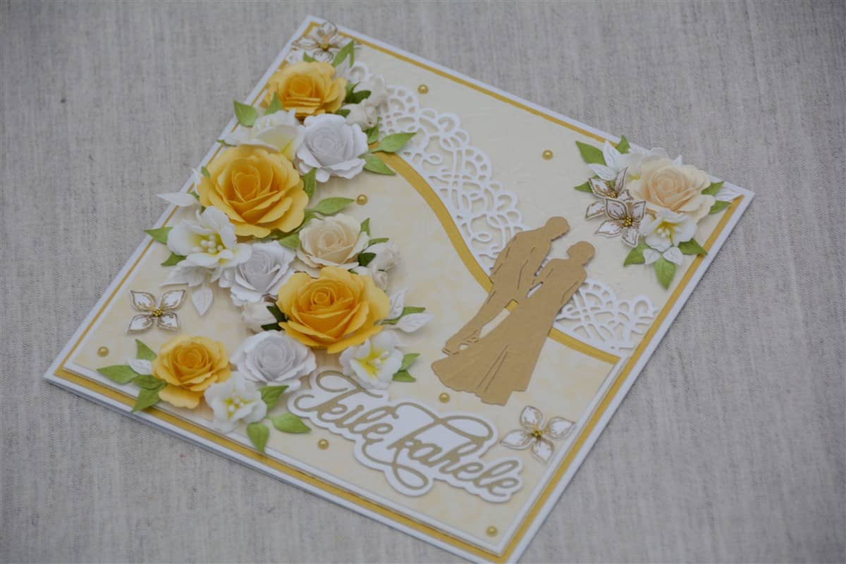 Valkoiselle kartongille tehdyssä kortissa on käytetty paperipitsiä, kultaisia helmiä sekä keltaisia, valkoisia ja kermanvärisiä ruusuja. Keltaiset ruusut on käsin värjätty. Halutessa korttiin voidaan lisätä rahatasku.