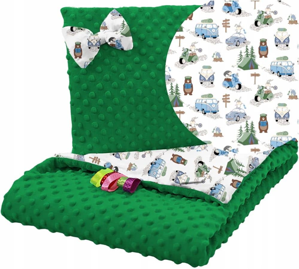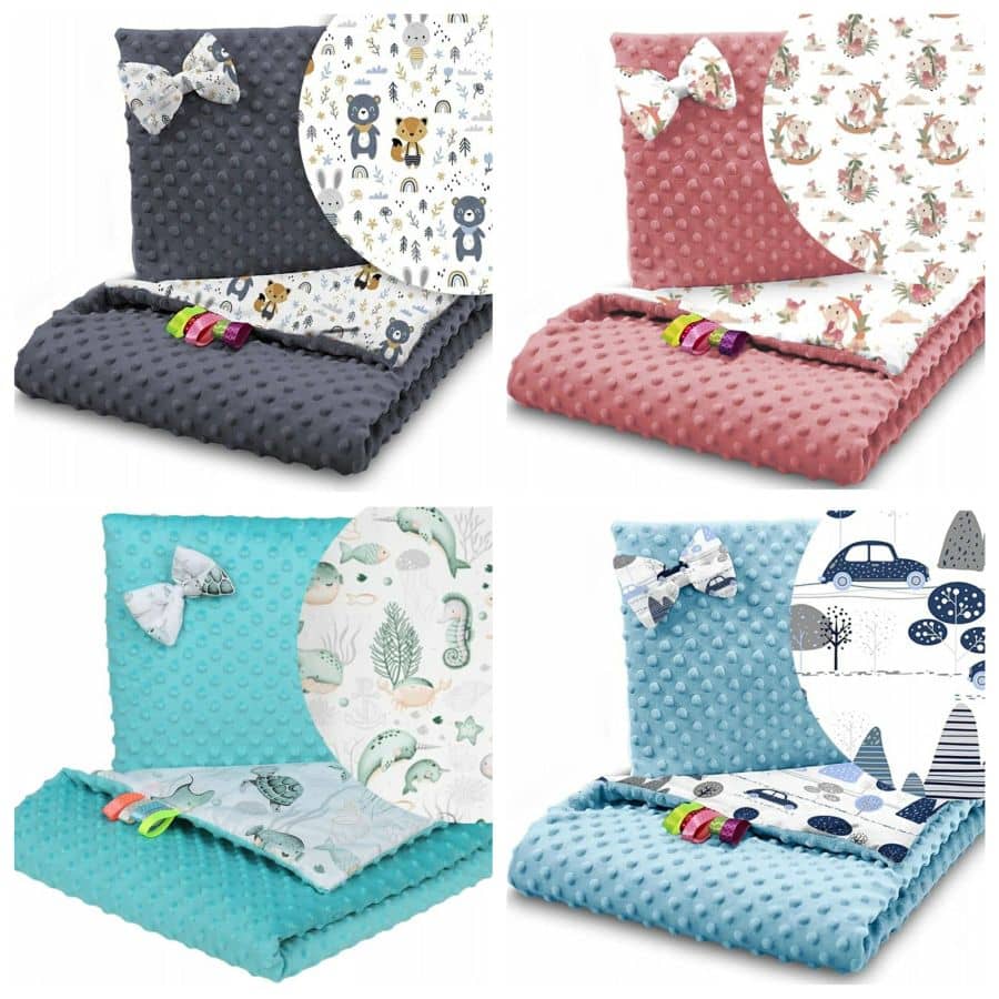 Sekä peitto että tyyny ovat kaksipuolisia – toisella puolella on pehmeä samettinen minky-materiaali ja toisella puolella puuvillakangas eri kuvioilla.