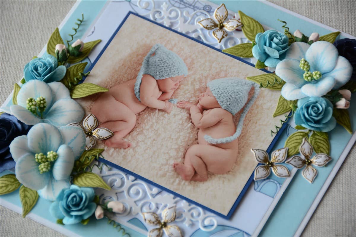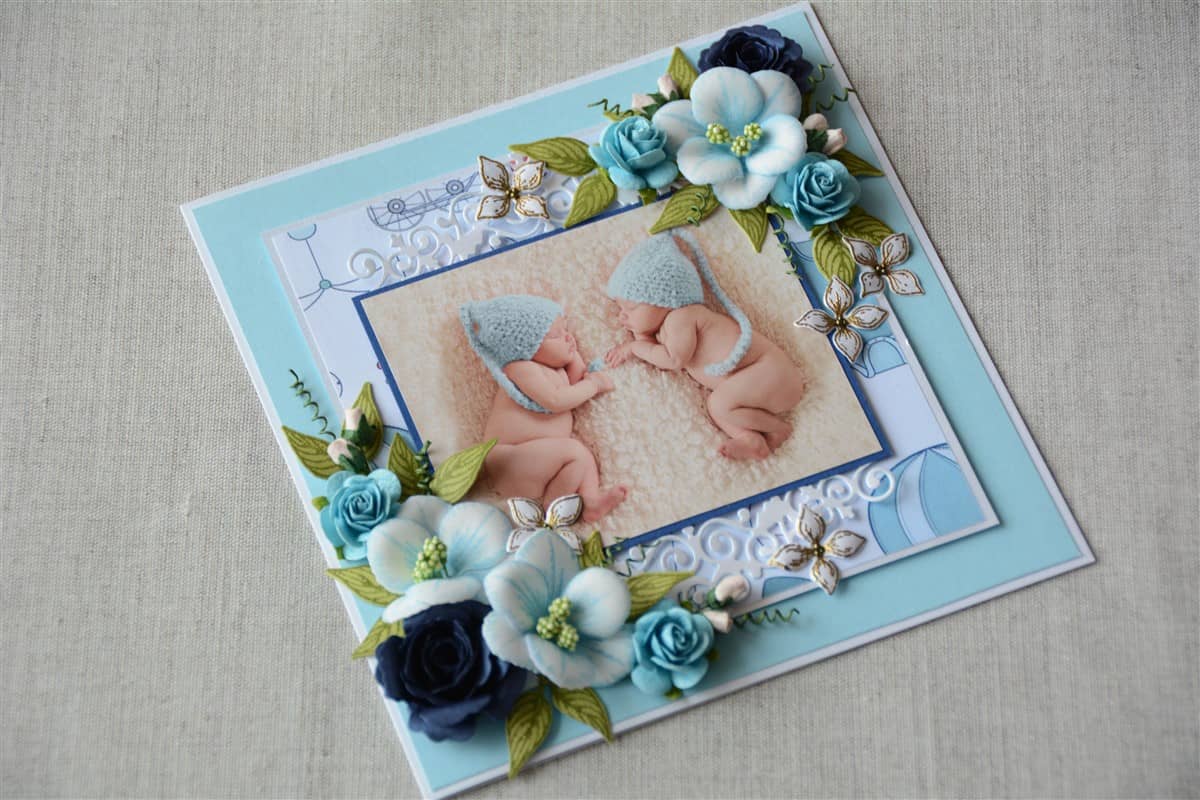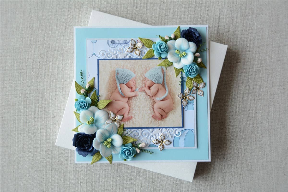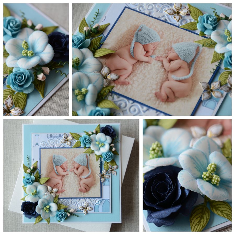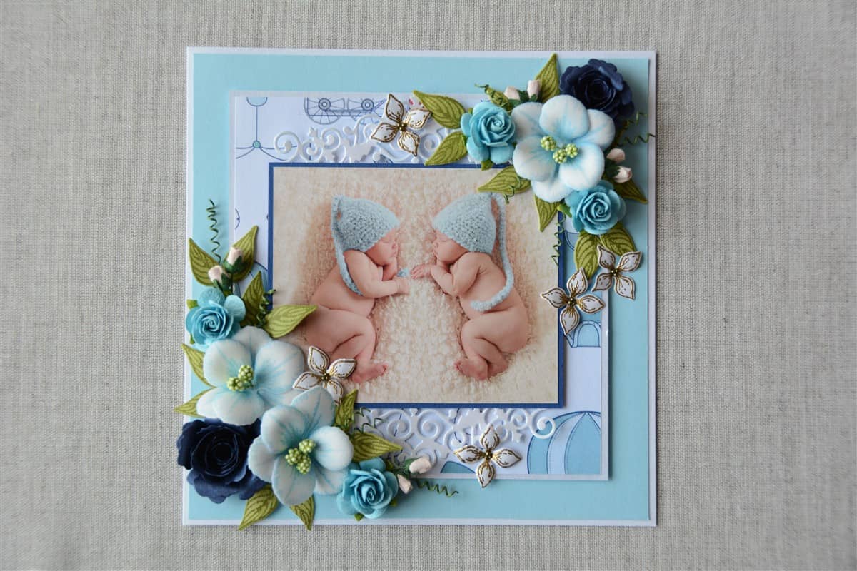 Valgest kartongist kaart, mis on kaunistatud tumesinise, helesinise ja mustrilise disainpaberiga ning valge metallik-käsitööpaberiga. Kaardil on foto kaksikutest poistest, mida kaunistavad käsitööna valmistatud ja värvitud imelised sinised lilleõied. Kaardile on lisatud natuke kuldset tooni pisemate lilleõitega. Kaunitele õitele lisavad efektset aktsenti Mulberry sinised roosid.