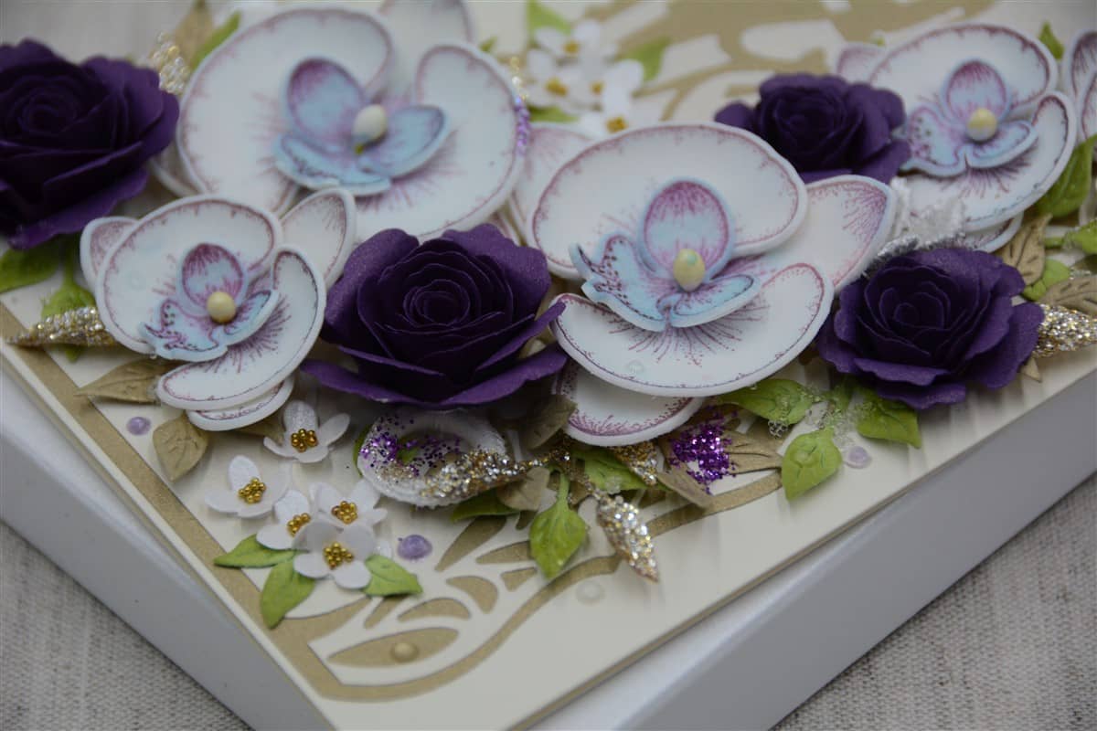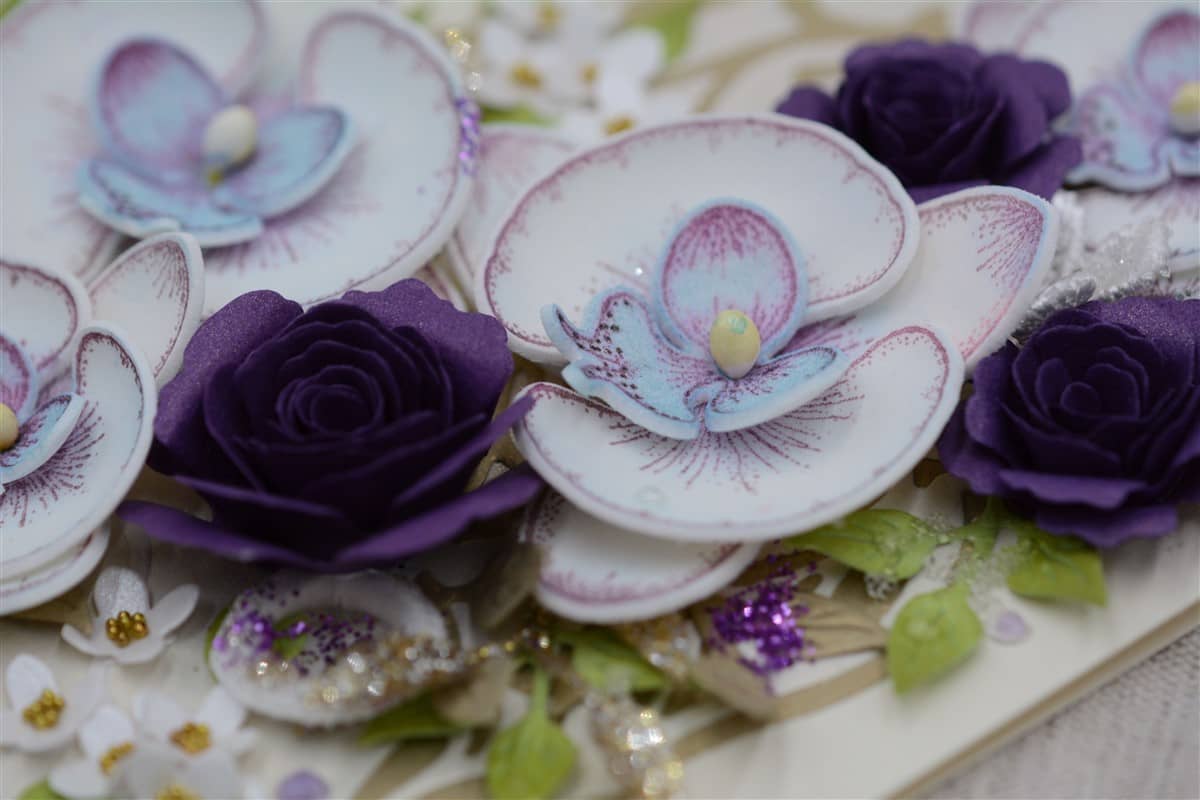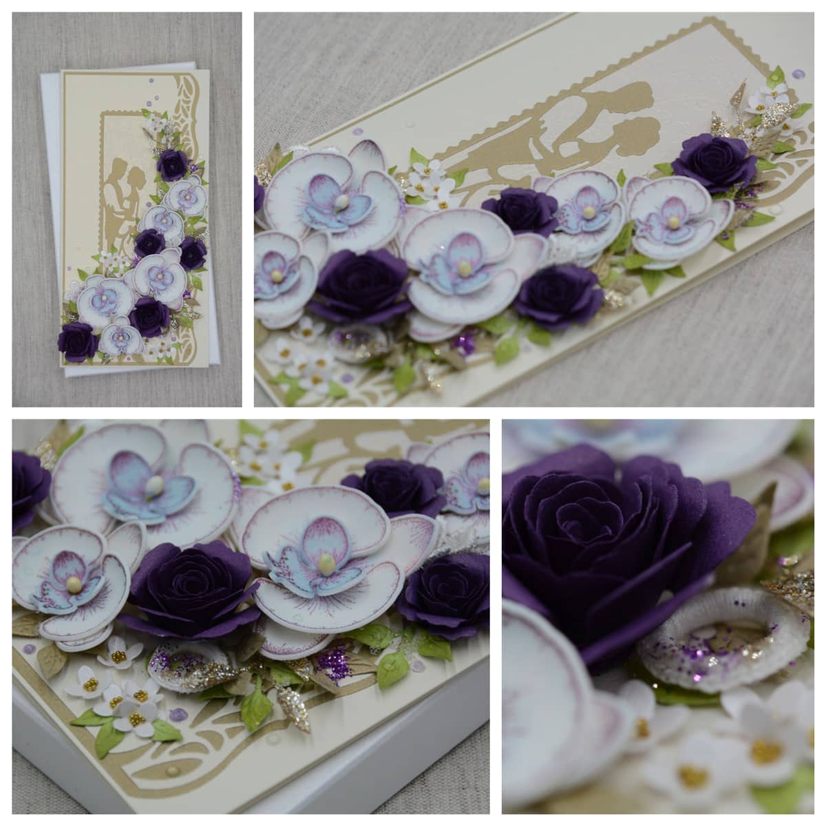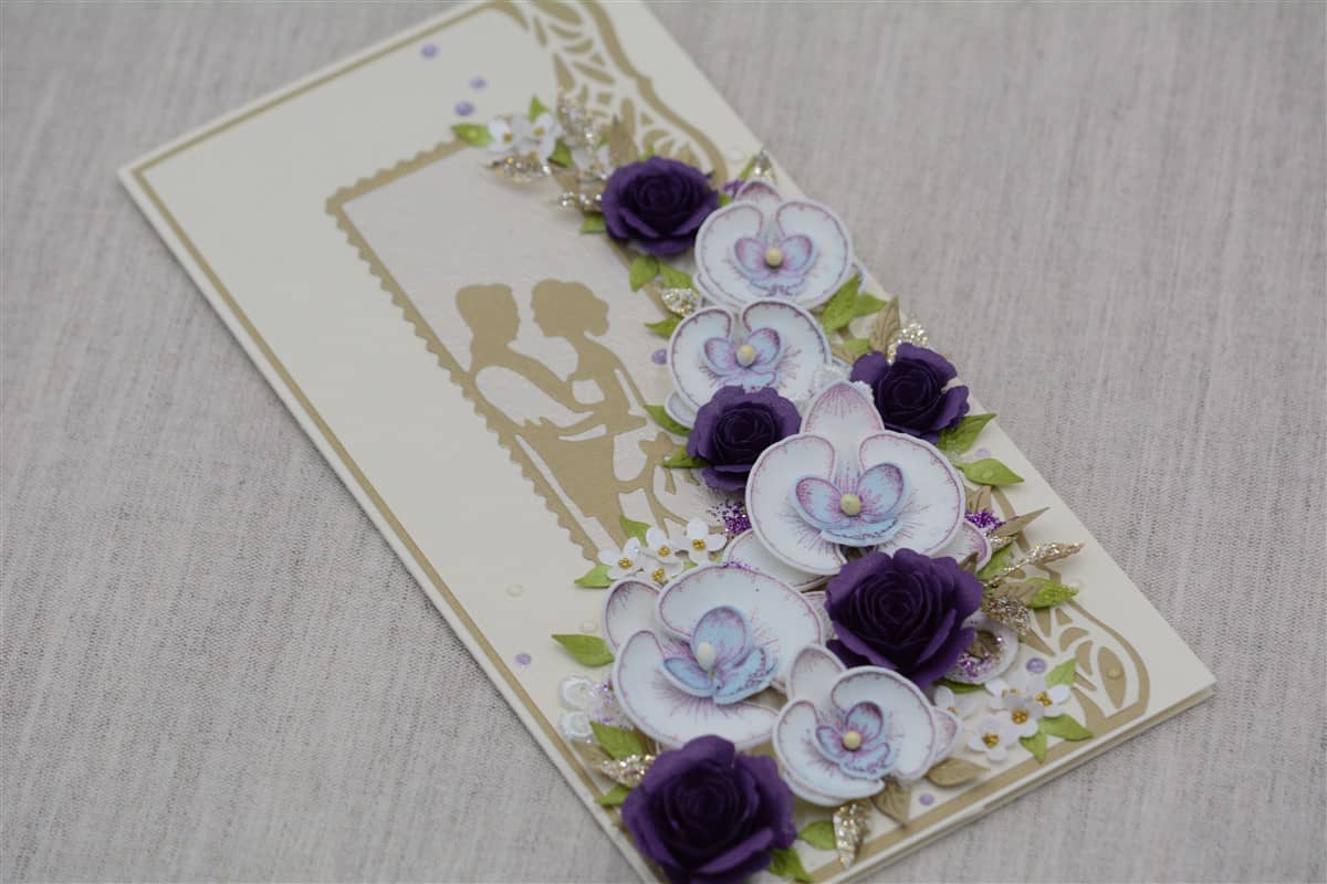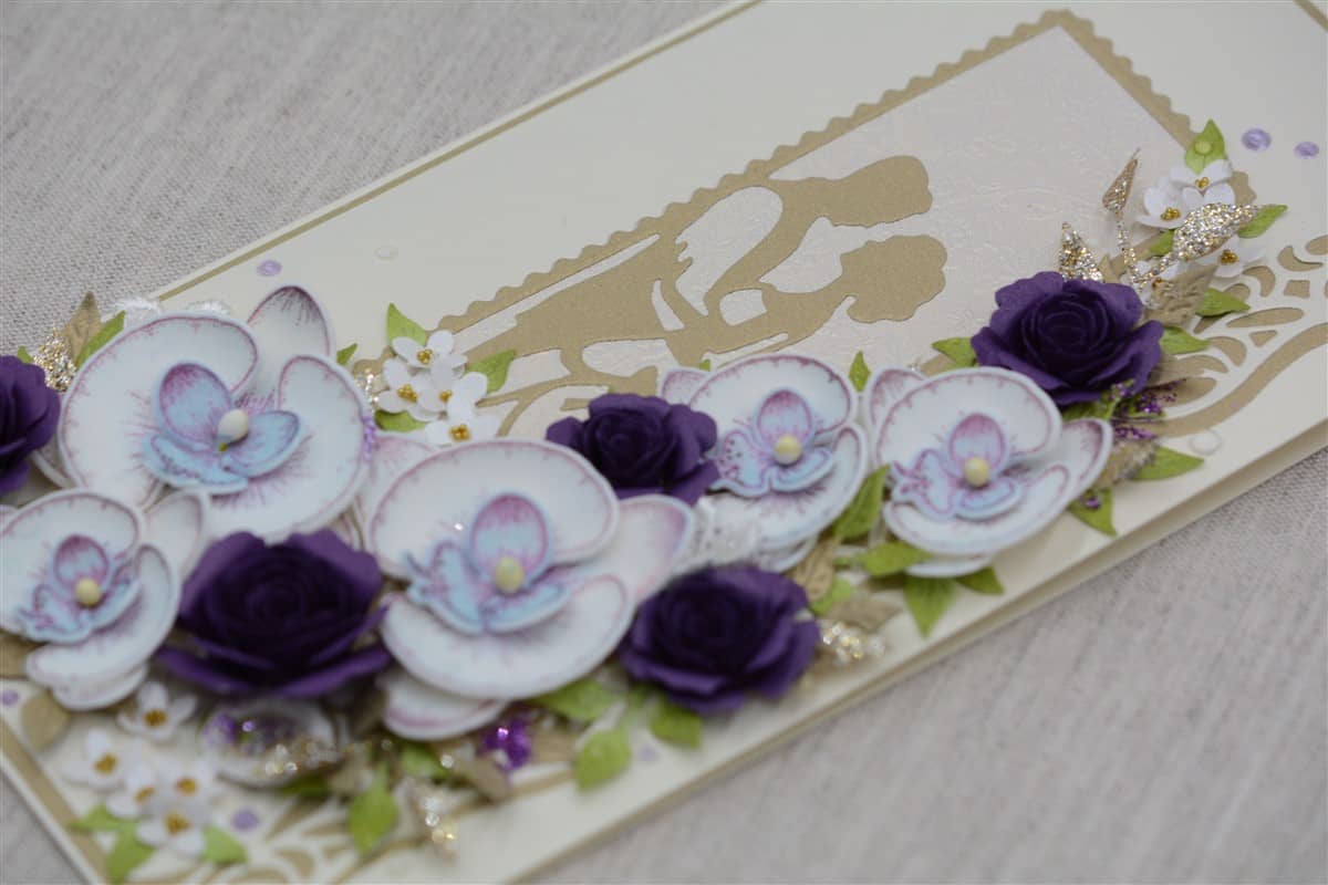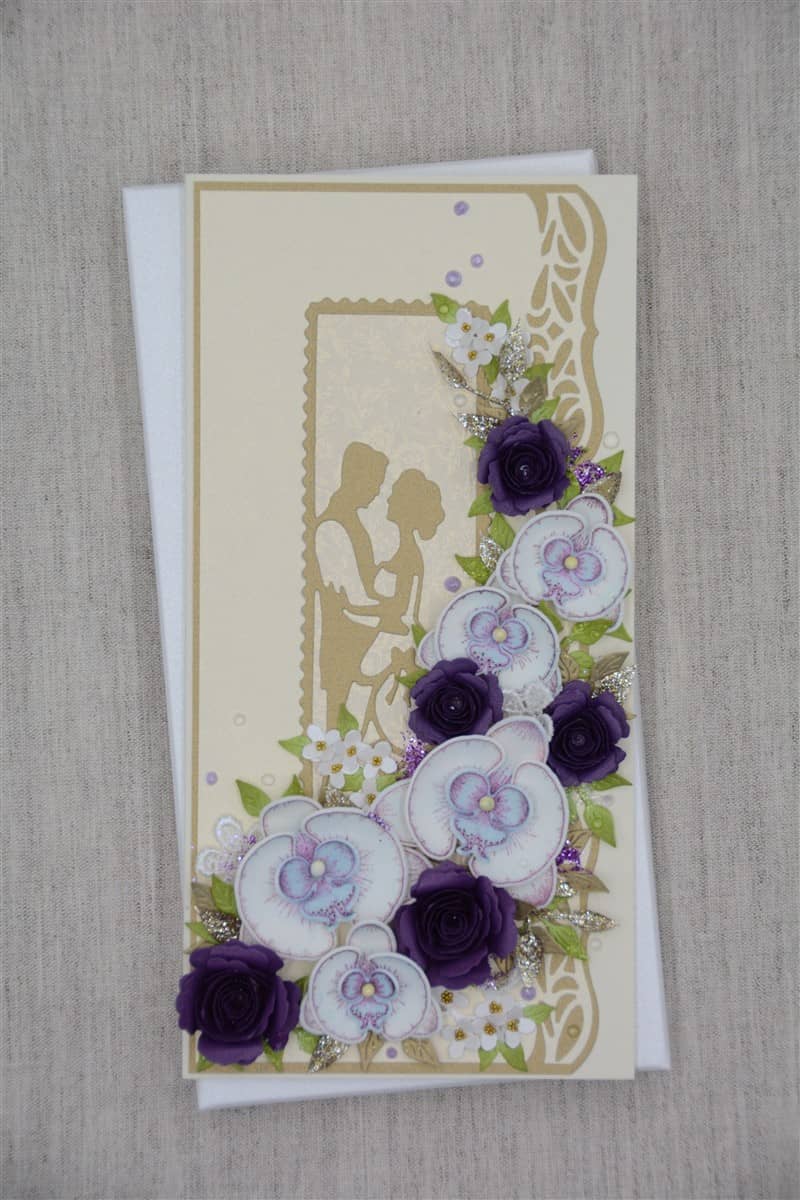 Kreemikat tooni kartongist käsitöökaart, mida kaunistavad käsitööpaberist lillad roosid ja foamiraanist käsitööna valmistatud orhideed, erinevad pitsilised ning heegeldatud detailid. Kaardile on lisatud glitter- ja särapulbrit. Kaardi sisse on võimalik lisada rahatasku.
